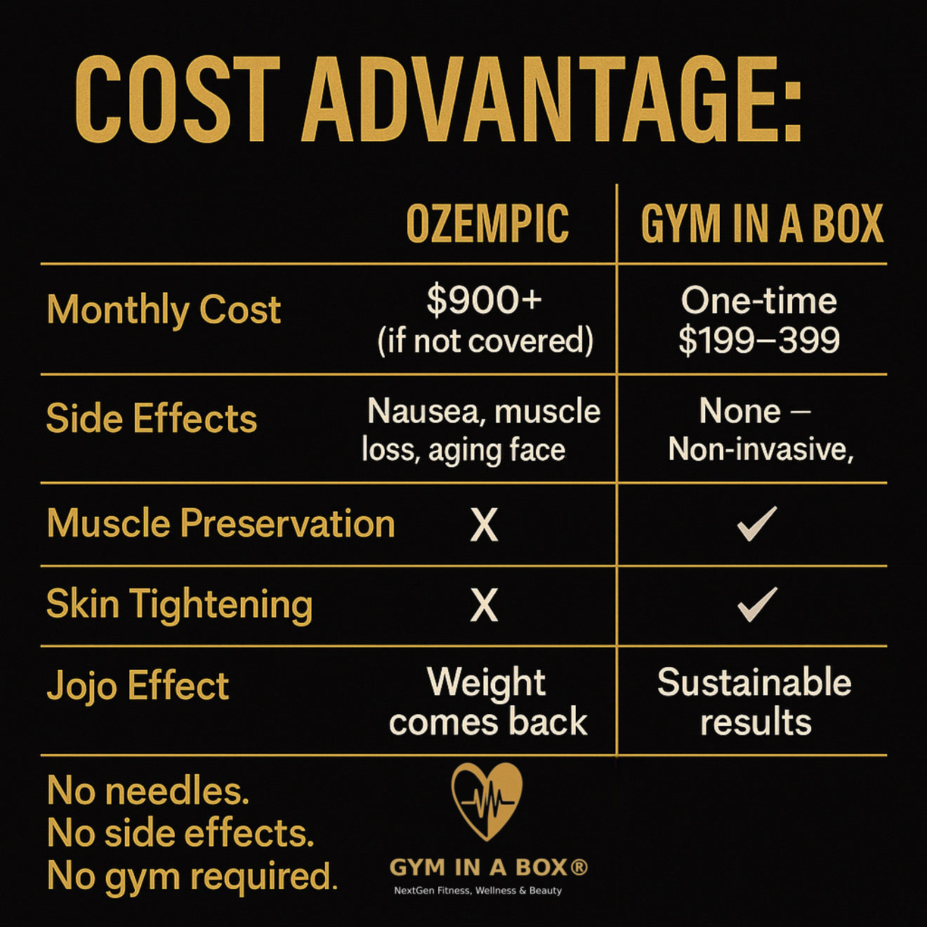 Let's face it, weight loss drugs may promise weight loss, but they do nothing for your overall health and wellness. Sure, they may help you shed some pounds, but do they build muscles or improve your fitness? No. But fear not, because GYM IN A BOX is here to save the day.